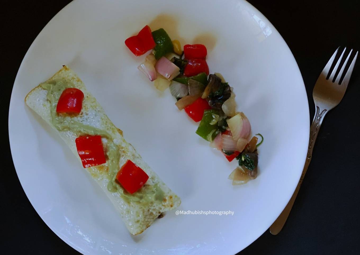 - Garnish with avocado smoothie and some stir fry red capsicums. Enjoy