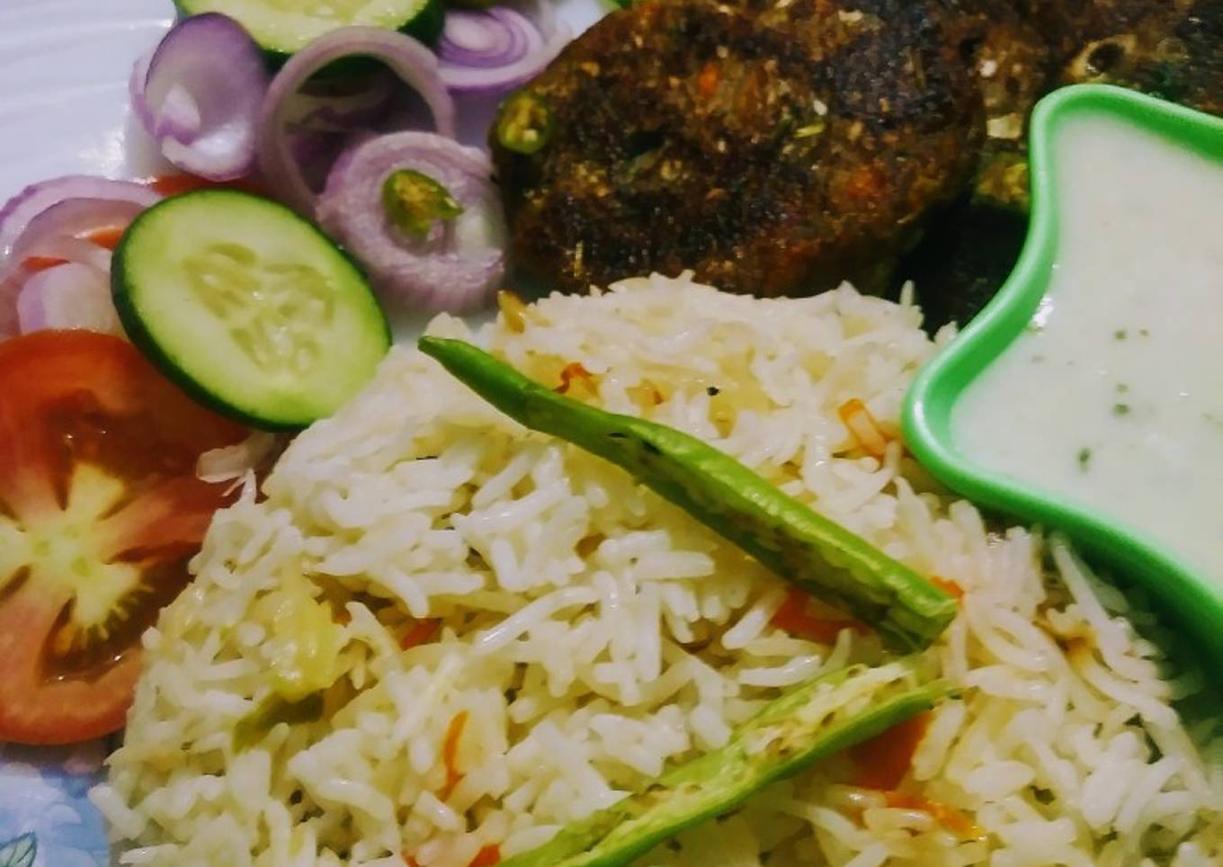 - Veg kabab and rice are ready serve with salad and raita