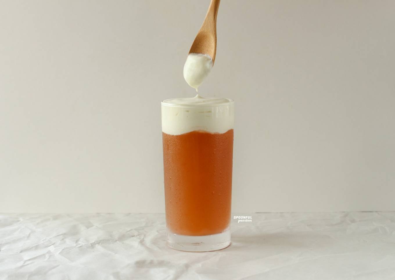 - Add ice cubes into a glass (optional) and cold tea. Then top with the cheese foam. Enjoy!