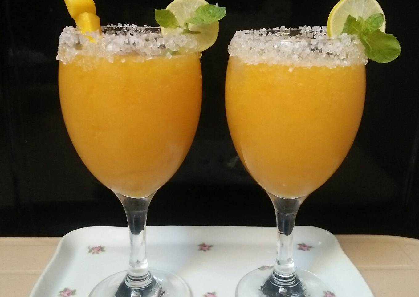 - Blender me mango cubes ice cubes sugar lemon juice or green tea dal kar achy sy blend karein
