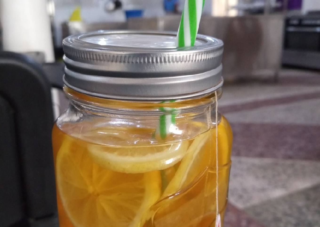 - In a jar, squeeze out lemon juice, drop the tea bag, add lemon slices, add hot water and let it seat for 5mins add ice blocks and serve.it has no sugar!