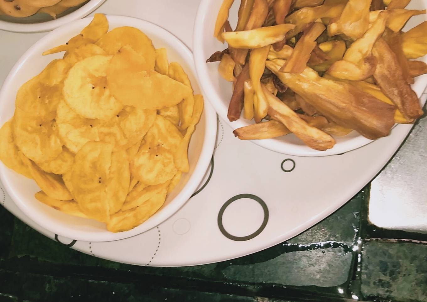 - Then in one small ball make water yellow with salt and make the chips of banana with grated machine directly in the oil after three minutes sprinkle yellow water in the chips till it becomes yellow. Fry it till cropsey same jackfruit chips same way and serve in the plate or bowl